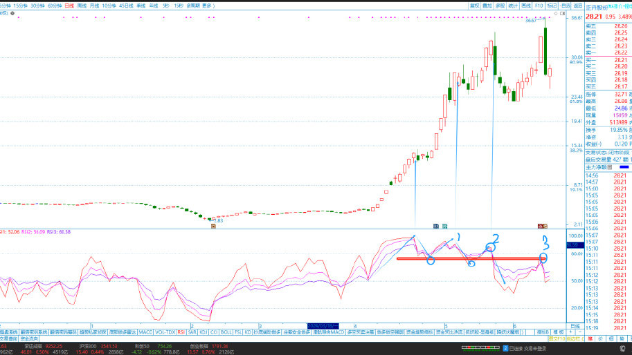 2、观察背离现象:当股票价格创新高点而RSI指标未能达到前期高点时,可能意味着市场动量减弱,这称为顶背离;相反,当股票价格创新低点而RSI指标未能达到前期低点时,称为底背离,可能意味着市场反弹即将来临。
